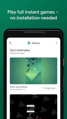KEY FEATURES • Instant play: There’s no installation needed – look for the "Instant play" button to instantly play full games. • Built-in Google games: Play Solitaire, Minesweeper, Snake, PAC-MAN, Cricket, and Whirlybird – even when you’re offline. • Save your progress: Your progress is automatically saved to the cloud when you see "Progress saved by Play Games." • Gamer profile: Create a custom gamer ID, unlock achievements, earn XP, and level up. • Gameplay recording: Easily record and share your best gameplay moments.